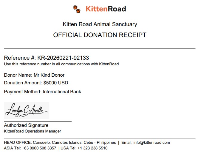 An official KittenRoad Donation receipt will automatically download to your device as a PDF document which you can view, share & save and you will instantly recieve an official email receipt.